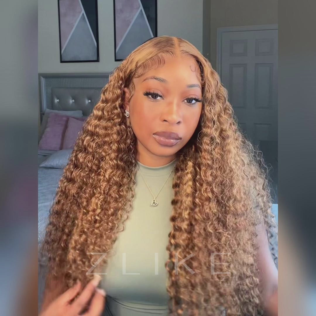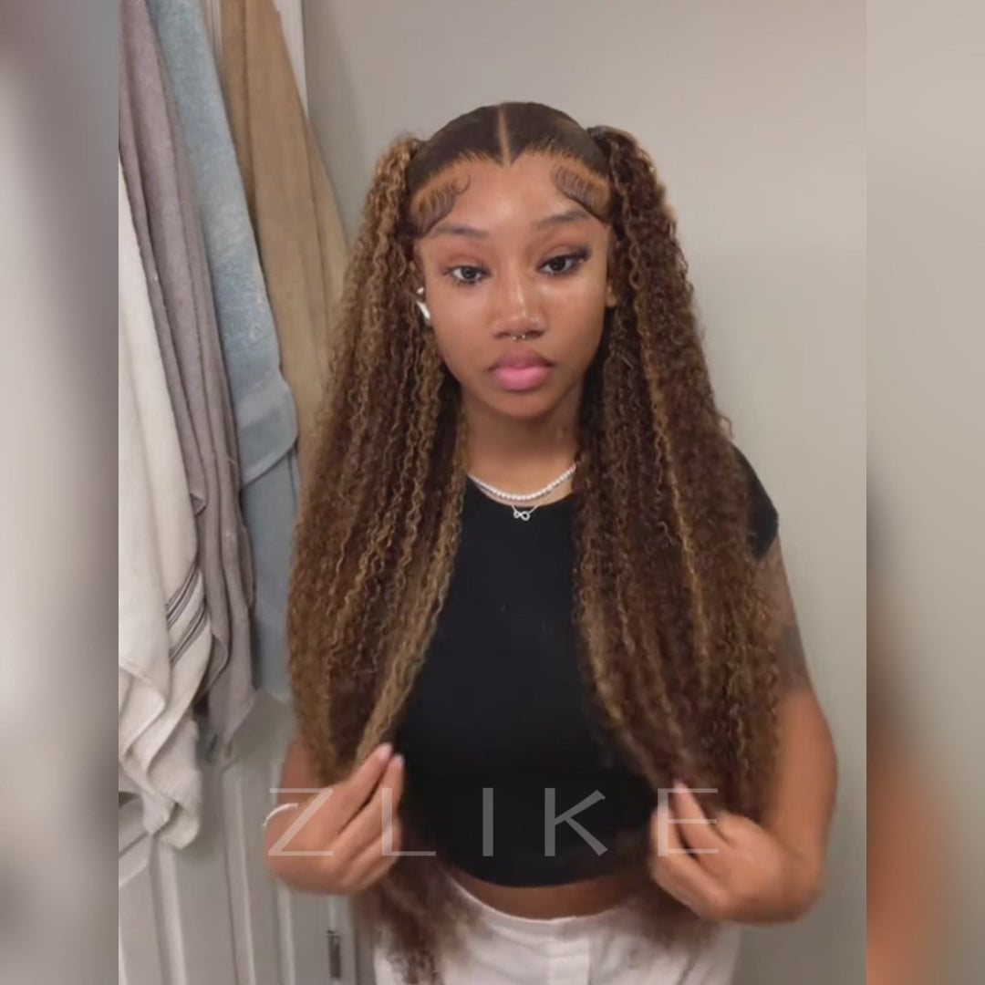 Natural Hairline Kinky Curly Lace Wig #4/27 Honey Blonde Highlights Colored Human Hair Wigs