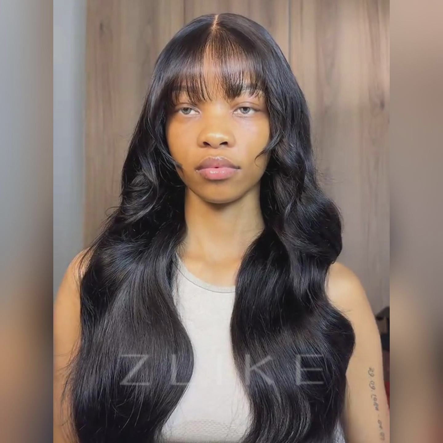 Zlike Pull Go Loose Wave With Wispy Air Bangs Side-Part Fluffy Wigs 100% Human Hair Lace Frontal Wigs
