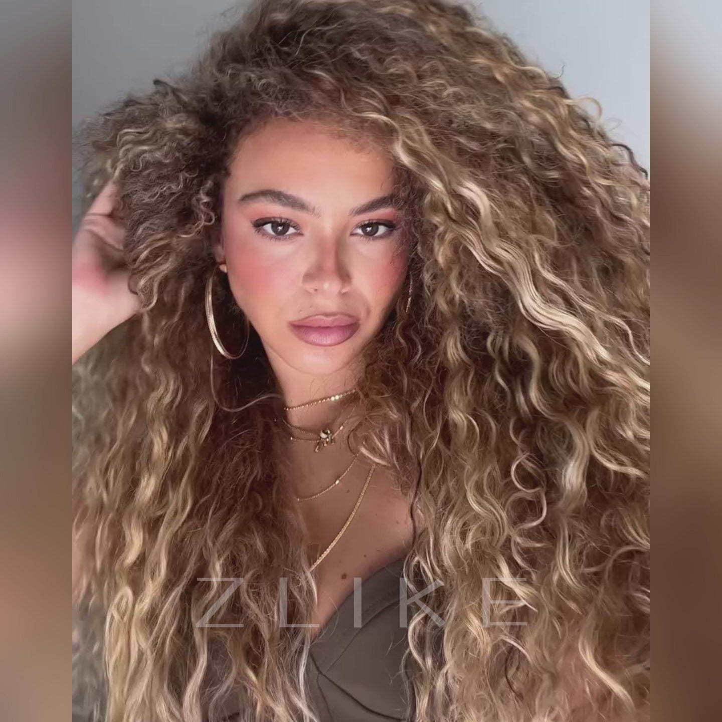 Zlike Spiral Loose Curls Honey Blonde Highlight 13x4 Lace Front 100% Human Hair Wigs Brazilian Human Hair