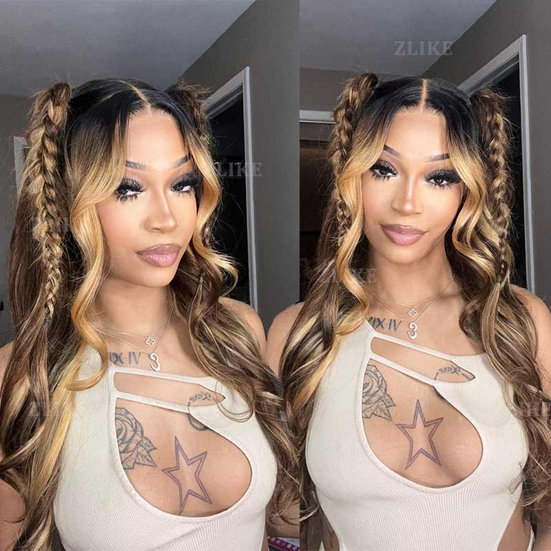 Code: ZL100F | Body Wave Black Roots 4/27 Ombre Highlight Transparent Lace Front Human Hair Wigs-Zlike