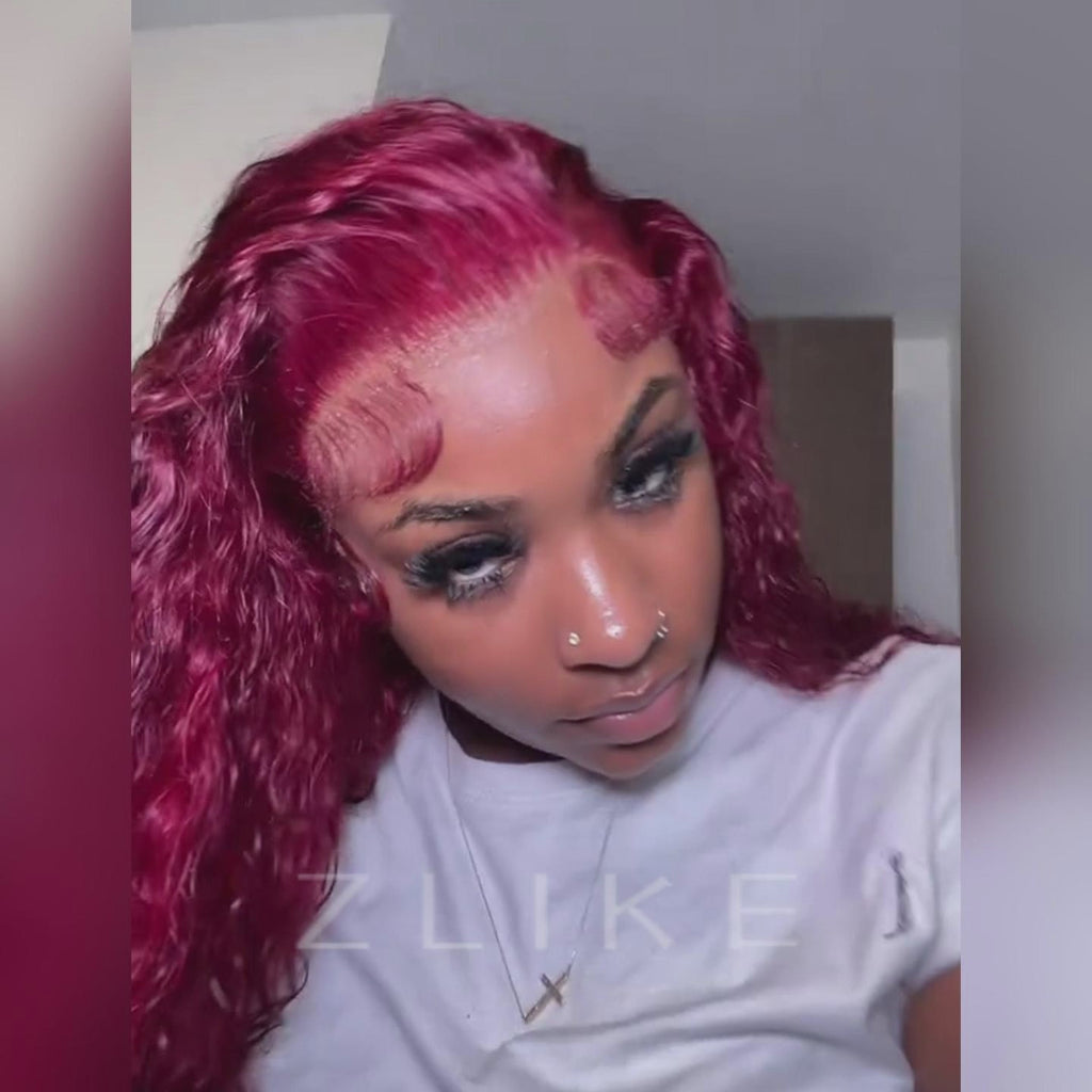 Clearance Sale | 99J Burgundy Red Colored Water Wave 100% Human Hair Transparent Lace Front Wigs