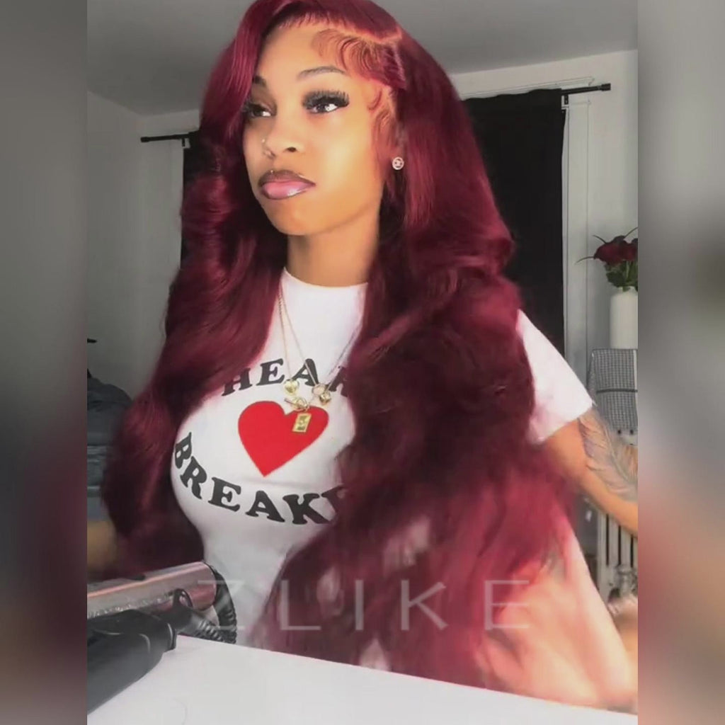 Clearance Sale | Burgundy Red Colored Body Wave 100% Human Hair Transparent Lace Front Wigs