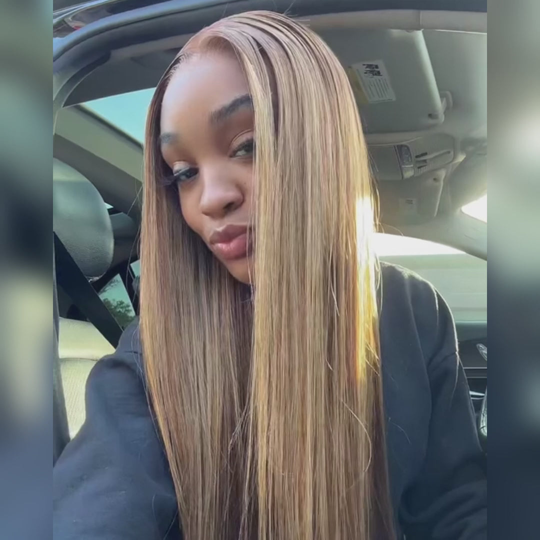 #4/27 Honey Blonde Highlights Straight Transparent Lace Closure Wig Glueless Human Hair Wigs