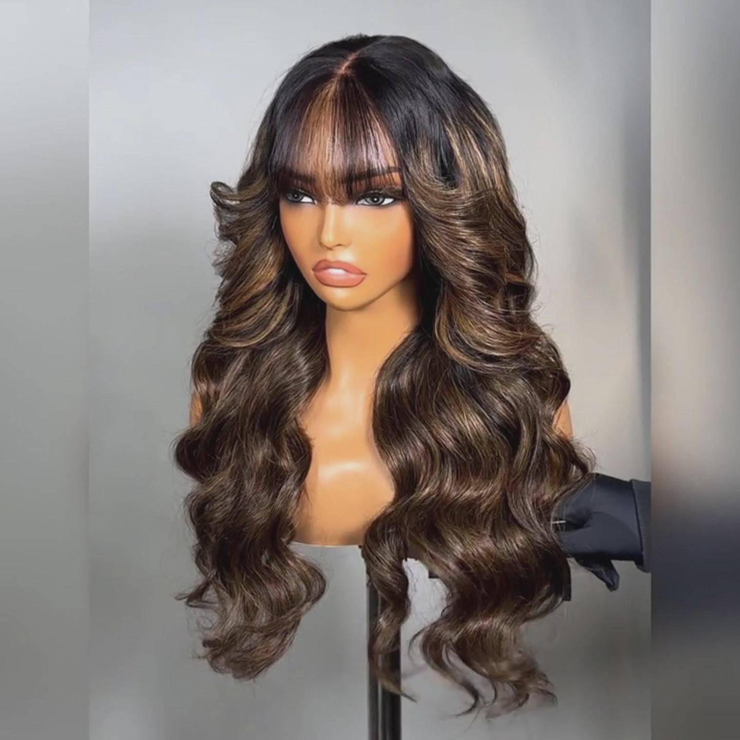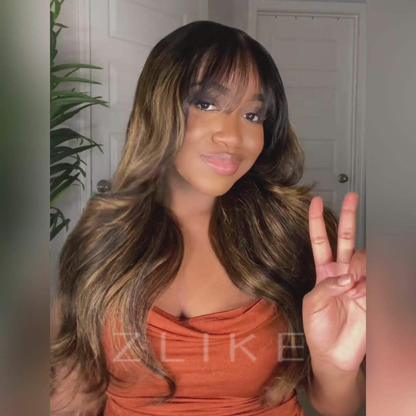 Zlike Balayage Highlights Fluffy Natural Loose Wave Wigs 100% Human Hair Lace Front Wigs With Bangs