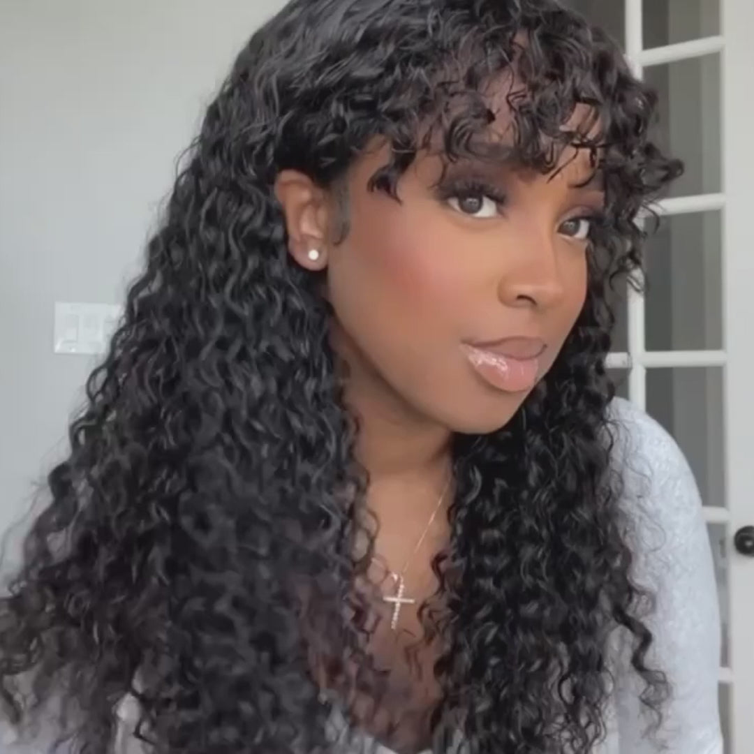 Zlike Curly Wave Wig With Bangs Natural Color Human Hair Glueless Wigs