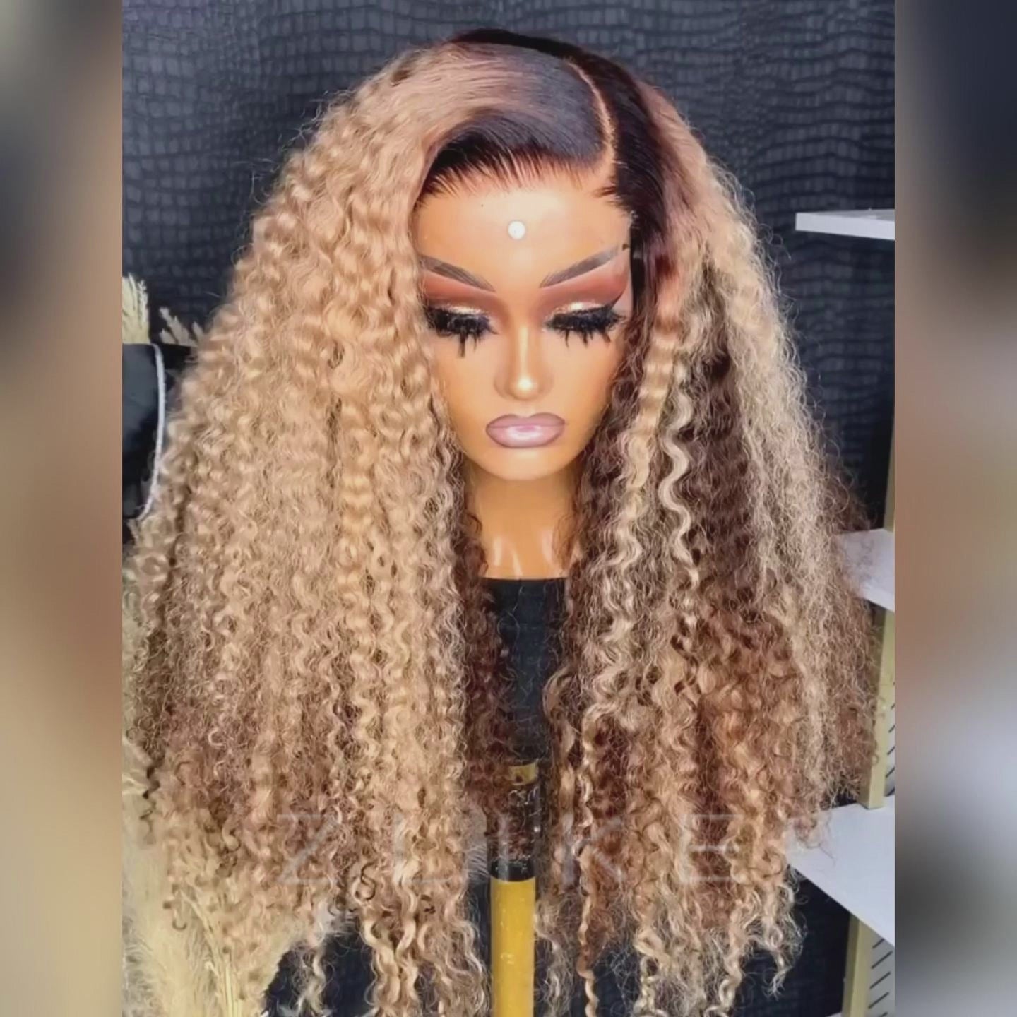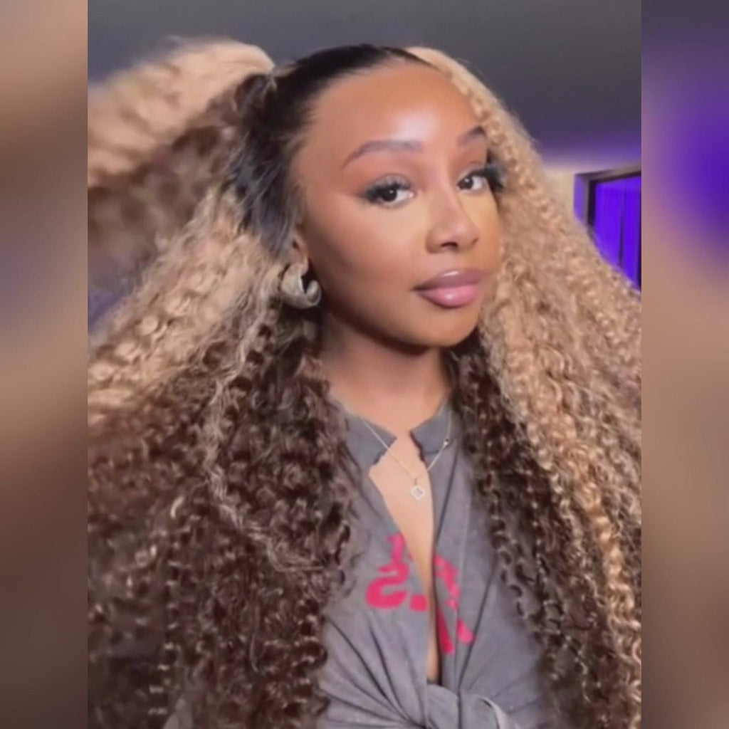Zlike Honey Blonde Highlight Water Wave Wigs With Dark Roots 13x4 Lace Front Human Hair Wigs